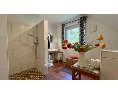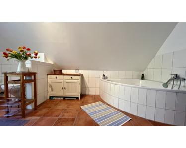 Im großem Familienbad gehören eine Eckbadewanne, ein Bidet, ein WC, ein Waschbecken und eine ebenerdige Dusche zur Ausstattung.