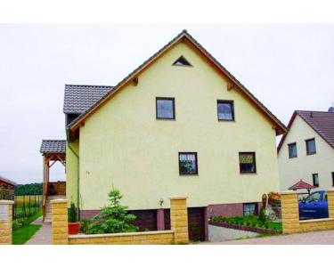 Das Haus ist mit 36,5 cm starken Hochlochziegeln und Betonmassivdecken gebaut. Die Außenwände sind mit einem Wärmedämmputz + Münchener Rauhputz verputzt. Die Innenwände sind ebenfalls massiv und mit Kalk-Zementputz verputzt.