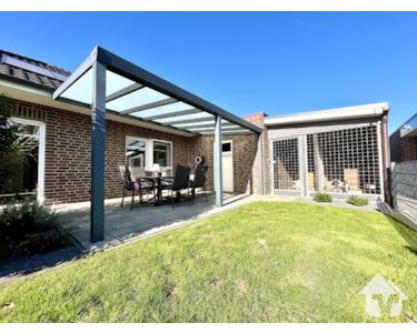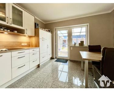 Das Herzstück des Hauses bildet der helle Wohn- und Essbereich mit großen Fensterflächen und direktem Zugang zur überdachten Terrasse – der perfekte Ort für entspannte Stunden im Freien. Von hier aus gelangen Sie außerdem in den praktischen Geräteraum, der zusätzlichen Stauraum für Gartenutensilien oder Fahrräder bietet.