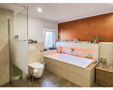 Ein modernes Tageslichtbad mit LED-Beleuchtung und einem komfortablen Dusch-WC von Duravit unterstreicht den hohen Ausstattungsstandard ebenso wie die Fußbodenheizung, dimmbare Deckenspots und Jalousien. Ergänzt wird das Raumangebot durch ein separates Schlafzimmer im Erdgeschoss sowie weitere Zimmer im Dachgeschoss, darunter drei Kinderzimmer, ein Gästezimmer und ein großzügiger Arbeitsbereich – ideal für Homeoffice, Hobbys oder Besuch.