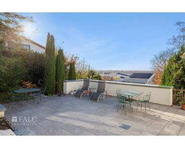 Vom Wohnzimmer gelangen Sie auf eine große Südwest-Terrasse (58 m²) mit direktem Zugang zum wunderschön angelegten Garten. Dort können Sie Ihrer Kreativität freien Lauf lassen und sich einen Ort der Erholung gestalten.