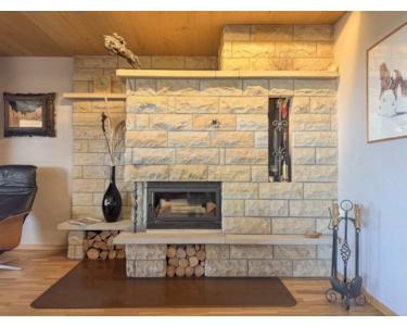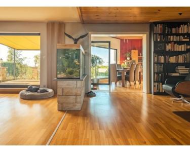 Das große Wohnzimmer beeindruckt mit riesigen Panoramafenstern, die einen traumhaften Blick in den liebevoll angelegten Garten und auf das direkt anliegende Feld bieten. Der angrenzende Essbereich ist leicht separiert und lädt zum gemütlichen Beisammensein ein. Der Kamin bringt zusätzliche Wärme in das Haus.