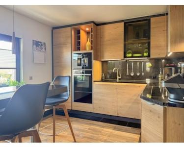 Über einen einladenden Eingangsbereich gelangt man in das stilvoll gestaltete Erdgeschoss. Hier befindet sich ein Gäste-WC sowie die großzügige Küche mit hochwertiger Einbauküche (im Kaufpreis enthalten) und integriertem Essbereich.