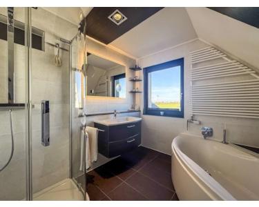 Über das schöne Treppenhaus erreicht man das Obergeschoss mit einem modernen, exklusiv ausgestatteten Badezimmer, inklusive großer Badewanne und ebenerdiger Dusche.