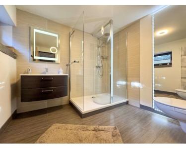 Auch der Untergeschossbereich überzeugt mit durchdachtem Raumkonzept: Ein weiteres, modernes Badezimmer mit großer Dusche, ein Schlafzimmer sowie ein Wohnbereich mit Ausgang nach draußen schaffen ideale Bedingungen für Gäste, Familienmitglieder oder eine Einliegerwohnung. Ergänzt wird dieser Bereich durch einen großen Hauswirtschaftsraum, eine Werkstatt, sowie eine geräumige Garage.