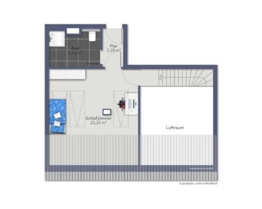 Eine schöne Holztreppe führt Sie vom Wohnzimmer aus in das obere Stockwerk der Maisonette-Wohnung. Hier befindet sich ein weiterer Raum, der sich ebenfalls als Schlafzimmer oder Büro eignet, ein kleiner Flur mit zweitem Fluchtweg und weiteren Abstellmöglichkeiten, sowie ein weiteres Badezimmer mit Dusche.
