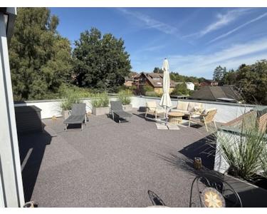 Diese Wohnung vereint Licht, Großzügigkeit und modernes Wohngefühl. Auf ca. 99 m² erwartet Sie ein offenes Raumkonzept mit bodentiefen Fenstern, das den Wohnbereich den ganzen Tag über mit natürlichem Licht erfüllt. Herzstück ist der großzügige Wohn- und Essbereich mit Zugang zur beeindruckenden 110 m² Dachterrasse – ein echtes Highlight. Dank automatischer Bewässerungsanlage verwandelt sie sich in eine pflegeleichte, üppige Grünfläche, die ideal zum Entspannen, Sonnen oder für gesellige Abende in besonderer Atmosphäre ist.