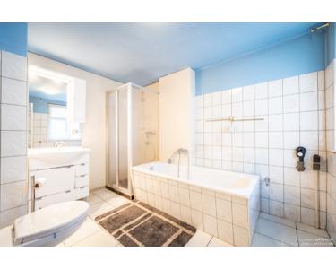 Auf der rechten Seite vom Flur befindet sich das prsktische Tageslichtbad mit Dusche und Badewanne.