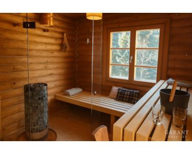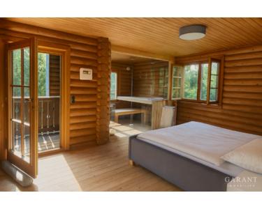Auch das Schlafzimmer überzeugt mit seinem harmonischen Materialmix aus massiven Blockbohlen und modernen Akzenten. Die integrierte Privatsauna macht den Raum zu einem exklusiven Rückzugsort und schafft ein luxuriöses Wellnessambiente.