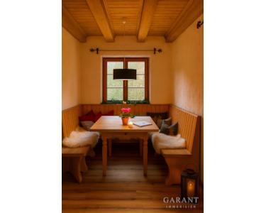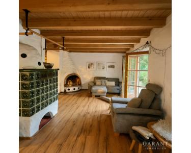 Schon beim Betreten entfaltet sich die besondere Ausstrahlung dieses Objekts: Warme Blockholzwände, sichtbare Balken und weiß gekalkte Naturputzwände schaffen eine harmonische, authentische Atmosphäre. Der offene Wohn- und Essbereich begeistert mit viel natürlichem Licht, gemütlicher Sitzecke und einem stilvollen Chalet-Flair, das durch die Liebe zum Detail spürbar wird.