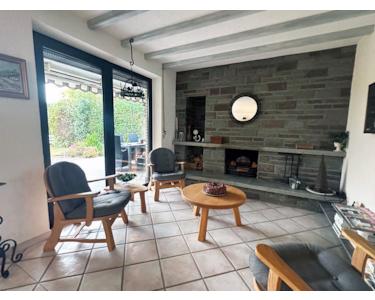 Das Erdgeschoss ermöglicht barrierearmes Wohnen. Mittelpunkt hier ist das große, angenehm helle Wohn- und Esszimmer mit gemütlicher Kaminecke. Großflächige Fensterelemente sorgen für ein freundliches Wohnambiente.