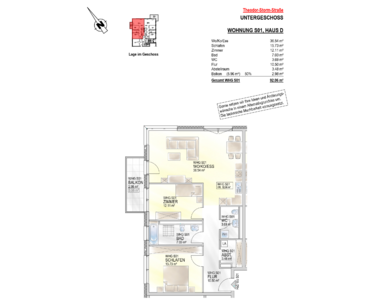 Das Angebot bezieht sich auf die Wohnung S 01 im Untergeschoß. Sie gelangen über eine geräumige Diele mit Garderobe in die Wohnung. Von der Diele gelangen Sie in den hellen geräumigen Wohn/Eßbereich mit offener Küche von ca. 37 m² mit Ausgang auf den schönen Balkon. Von der Diele gelangen Sie ebenfalls in das Kinderzimmer/Büro (ebenfalls mit Zugang zum Balkon), das geräumige Bad mit Fenster von ca. 7 m² - ausgestattet mit Wanne und Dusche sowie das gut aufgeteilte Schlafzimmer von ca. 16 m². Garderobe, Gäste-WC und Abstellraum vervollständigen das Angebot. Die Wohnung hat eine Wohnfläche von ca. 93 m².