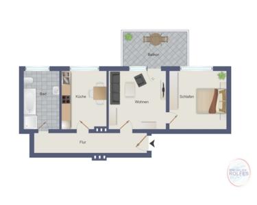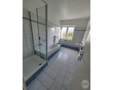Die Wohnung im Erdgeschoss besteht aus Wohnzimmer, Schlafzimmer, Küche, Diele und einem Dusch- und Wannenbad. Ebenfalls gehört zu der Wohnung ein massiv gebauter Kellerraum mit Fenster sowie ein PKW-Stellplatz. Die Böden im Flur, Bad und Küche sind gefliest, Wohnzimmer und Schlafzimmer in Holzbelag. Die Fenster sind doppelverglast in weißen Kunststoffrahmen.