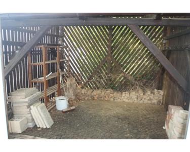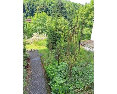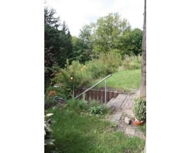 Der pflegeleichte Garten fällt nach Südwesten ab, er bietet allerlei Nutzungsmöglichkeiten, offener Schuppen.