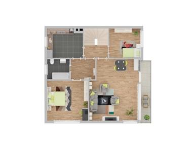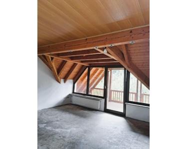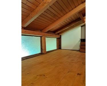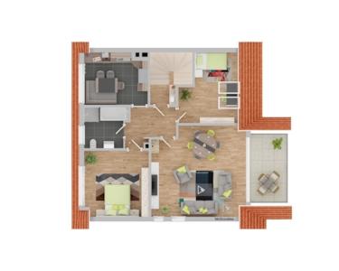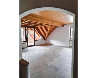 Der zweite Stock bietet ebenfalls eine drei Zimmerwohnung mit einer großen Loggia nach Süden, die teilweise offene Holzkonstruktion des Dachstuhls gibt dem Wohnzimmer, Schlafzimmer, Kinderzimmer und der Küche ein besoneres Flair, Bad mit Wanne/Dusche, große Wohnküche, von der Küche führt eine Tür zur rückwärtigen Terrasse. Gesamtwohnfläche 2. OG 82,20 qm.