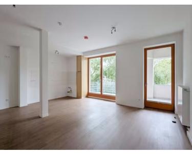 Der sonnige Wohnraum lässt sich sehr gut einrichten. Hier sind auch die Küchenanschlüsse integriert. Besonders reizvoll ist der große Süd-Balkon zur Hofseite mit Blick ins Grüne.