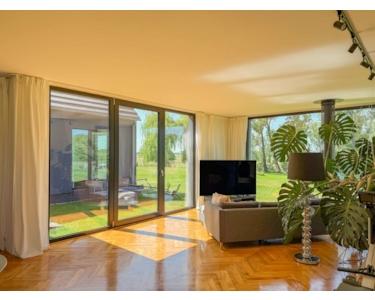 Schon beim Betreten fällt auf: Heller und großzügiger kann Wohnen kaum sein. Riesige Glasfronten mit dreifacher Wärmeschutzverglasung und Hitzeschutz lassen nicht nur maximales Tageslicht herein, sondern eröffnen auch einen traumhaften Blick in den weitläufigen Garten.