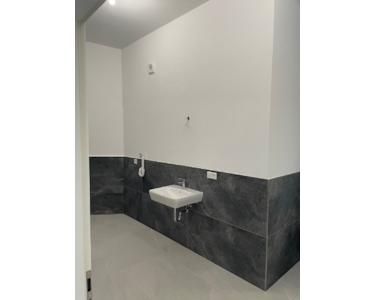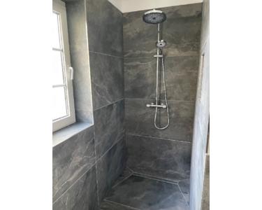 das Bad mit großer, bodengleicher Dusche, das separate WC und das ca 50 m² große Wohnzimmer. Die Küche ist als offene Küche zum Wohnzimmer hin abgetrennt.