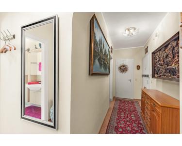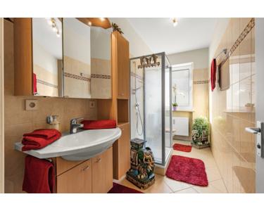 Der Eingangsbereich überzeugt mit einer praktischen Abstellkammer und einer langen Diele, die zum Badezimmer führt. Das helle, großzügige Bad ist mit einer Dusche ausgestattet und profitiert von natürlichem Lichteinfall. Dank der Westausrichtung erhält die Wohnung viel Tageslicht, wodurch eine freundliche und einladende Atmosphäre entsteht.