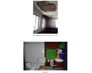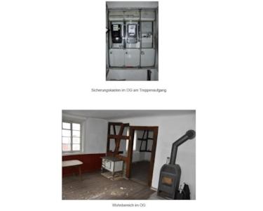 Durch den jahrelangen Leerstand hat sich der Zustand des Anwesens insgesamt weiter verschlechtert. Es zeigt massive Verschleißerscheinungen und überproportionale Baujahr typische Mängel und Beeinträchtigungen auf. Es bestehen Schäden und teils extreme Feuchtigkeitsmängel am Objekt und sichtbare Witterungsspuren, Rissbildungen und Putzabplatzungen. Die Kellerwände weisen konstruktionsbedingte Feuchtigkeitsschäden auf. Die Decke zum Obergeschoss ist teilweise durchgebrochen. Fachwerkholz ist stellenweise modrig, mit Wurmbefall und Gefache sind instabil. Ein Pilzbefall des Holzwerks ist aufgrund von stetigem Wassereindrang nicht auszuschließen. Ein Austausch von Tragbalken ist dringend angezeigt. Die Dacheindeckung ist überaltert und bedarf einer Erneuerung. Durchgeführte Sicherungsmaßnahmen dienen lediglich der akuten Gefahrenabwehr. An dem Gebäude sind grundlegende Sanierungsarbeiten erforderlich.