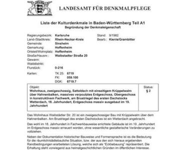 Das wohl im 18. Jahrhundert in Fachwerkbauweise errichtete Gebäude ist im 19. Jahrhundert im Erdgeschoss massiv erneuert worden, ohne wesentliche gestalterische Veränderungen zu vollziehen. Die Erhaltung des Wohnhauses steht vorwiegend aus heimatgeschichtlichen Gründen im öffentlichen Interesse. Bei der Gesamtanlage handelt es sich um ein Denkmal nach § 2 Denkmalschutzgesetz (Kulturdenkmal). Jegliche Arbeiten an diesem Gebäude bedürfen einer denkmalschutzrechtlichen Genehmigung. Hierzu steht Ihnen die Untere Denkmalschutzbehörde im Rathaus der Stadt Sinsheim zur Verfügung. Abteilung Baurecht: baurecht@sinsheim.de