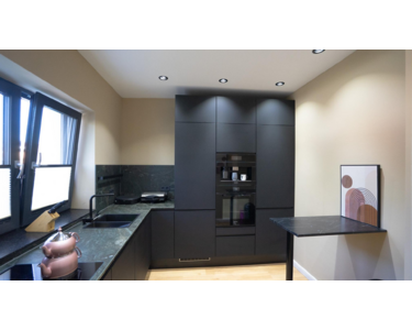 Die hochwertige Küche der Marke Leicht, der glatte Innenausbau mit gespachtelten Wänden, Zimmertüren und Vinylböden schaffen ein modernes und
