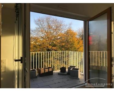 Balkon: Großer Balkon mit Blick auf Schrebergärten und Skyline