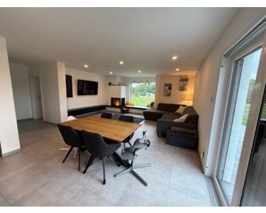 Beim Betreten des Hauses empfängt Sie ein heller Eingangsbereich, der nahtlos in den offenen Wohn- und Essbereich übergeht. Große Fensterfronten sorgen für viel Tageslicht und schaffen eine einladende Atmosphäre. Der Kamin und die Sitzbank am Panoramafenster sorgen für ein gemütliches Wohngefühl. Die moderne Küche ist mit hochwertigen Geräten ausgestattet und bietet ausreichend Platz für kulinarische Kreationen.