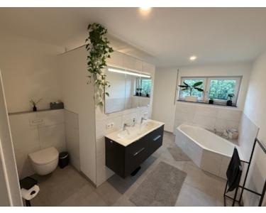 - Großes Elternbad mit bodengleicher Dusche, Badewanne, Doppelwaschbecken und WC