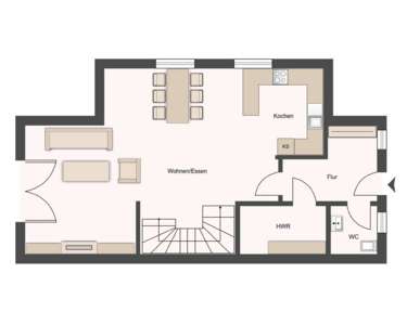 Bereits beim Betreten des Hauses über den Eingangsbereich spürt man die durchdachte Raumaufteilung und den hochwertigen Charakter des Hauses. Der Flur bietet ausreichend Platz für eine Garderobe und führt zum Gäste-WC sowie zum praktischen Hauswirtschaftsraum, in dem Technik und Waschmaschine bequem untergebracht werden können. Von hier aus gelangt man in den lichtdurchfluteten, offenen Wohn- und Essbereich, der mit seinen großen Fensterfronten und dem direkten Zugang zur Terrasse den Mittelpunkt des Hauses bildet. Das gesamte Erdgeschoss ist mit hochwertigen Fliesen gefliest.