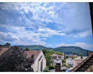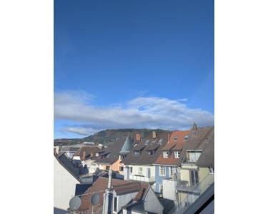 Schöner Blick über die Altstadtdächer zu den Höhenzügen der nahen Schweiz und zum Rand des Südschwarzwaldes.