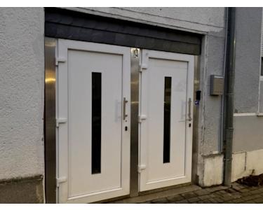 Eine Besonderheit: Durch frühere gewerbliche Nutzung existieren insgesamt vier Hauseingänge — zwei für das Wohnhaus (Nr. 43 und Anbau 43a) und zwei weitere für ehemals gewerbliche Einheiten, plus eine separate Außentür, die heute als Zugang zu Abstellräumen dient. Die Immobilie bietet damit flexible Zugangs- und Nutzungsmöglichkeiten.