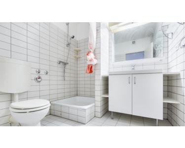 In der gesamten Wohnung befinden sich ein attraktiver Laminatfußboden oder weiße Bodenfliesen.
