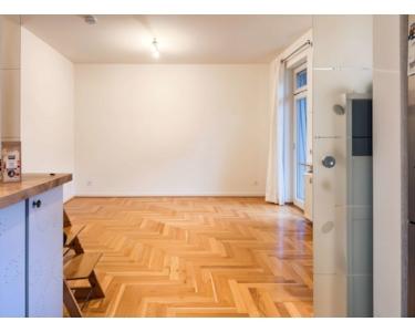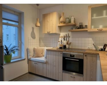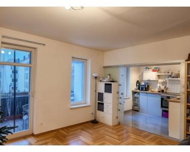 Linkerhand gelangen Sie in das großzügige Wohnzimmer mit Zugang zur Küche. Die Küche lässt sich durch eine verglaste Schiebetür praktisch vom Wohnbereich trennen. Vom Wohnzimmer aus haben Sie Zugang auf den Balkon mit Blick in den Innenhof.
