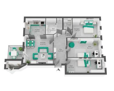 Rechterhand des Flurs gelangen Sie jeweils in die drei separaten Räume. Durch deren Größe zwischen ca. 13-16 Quadratmetern bieten sich alle Räume als Schlaf- bzw. Kinderzimmer an. Des Weiteren ist es ohne Probleme möglich einen dieser Räume als Gäste- oder Arbeitszimmer zu nutzen.