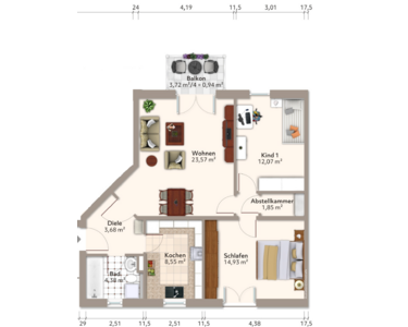 Neben den Wohnräumen verfügt die Wohnung über einen nützlichen Abstellraum, der zusätzlichen Stauraum bietet. Zusätzlich stehen Ihnen ein Fahrradkeller sowie ein persönliches Kellerabteil zur Verfügung – perfekt für eine geordnete und komfortable Lebensführung.