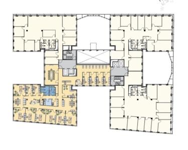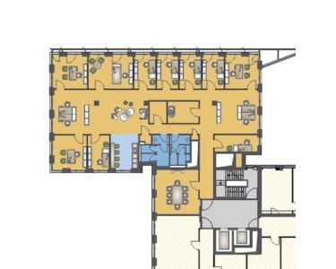 - Büroraumkühlung durch in der Decke verlegte, nicht sichtbare Kühlelemente, unterstützende Be- und Entlüftung und Fensterlüftung in allen Büros möglich