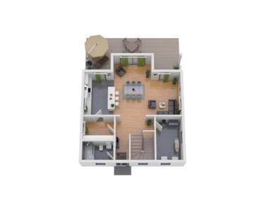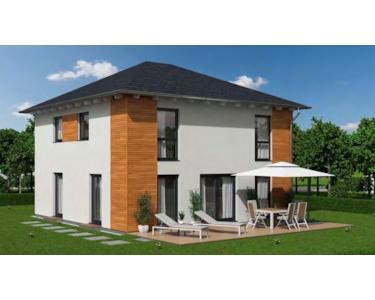 Der zweigeschossige Hausentwurf zur Stadtvilla bietet eine moderne Architektur mit einem Vordach und einer Teil-Holzverkleidung. An der Gartenseite des Hauses ist ein überdachter Terrassenbereich und ein Anbauelement geplant. Der Grundriss bietet im Erdgeschoss Platz für einen offen gestalteten Wohn-/Ess- und Kochbereich, eine Speisekammer, eine Diele mit Treppenaufgang, einen Haustechnikraum und ein Duschbad.