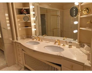 Die Fußböden sind mit hellem Wollteppich und Marmor ausgelegt. Neben dem Badezimmer mit Dusche und zwei Waschtischen und Fußbodenheizung verfügt die Wohnung über ein separates WC. Zudem steht ein Gäste-WC im Gemeinschaftsflur ebenfalls zur Verfügung.