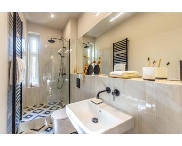 • Luxuriöses Bad: Walk-in-Dusche, Hansgrohe-System, LAUFEN-Waschtisch, Wand-WC, Zementfliesen & schwarze Armaturen