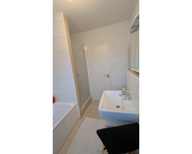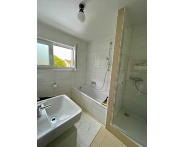 Das Tageslichtbad verfügt über eine Badewanne sowie eine Dusche. Zusätzlich steht ein separates WC zur Verfügung. Ein Kellerabteil bietet praktischen Stauraum, und im Haus befindet sich ein Gemeinschaftsraum für Waschmaschine und Trockner.