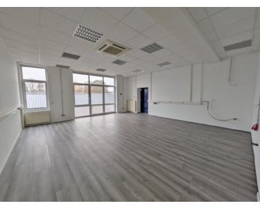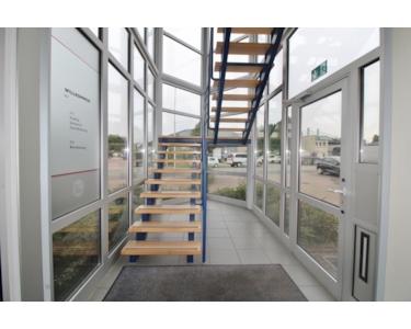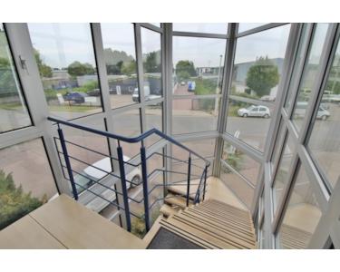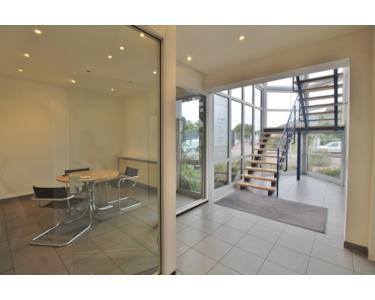 Der Zugang zum Haus erfolgt über ein gläsernes Treppenhaus, dem sich direkt ein Besprechungs-/Empfangsraum und Kunden-WCs anschließen. Es folgt ein großer Raum, welcher sich sowohl als Großraumbüro, als auch als Showroom ideal anbieten würde. Von diesem Raum gelangen Sie in die Lager- bzw. Produktionsfläche, die sich über insgesamt ca. 311 m² erstreckt.