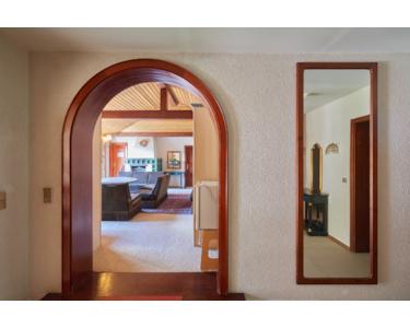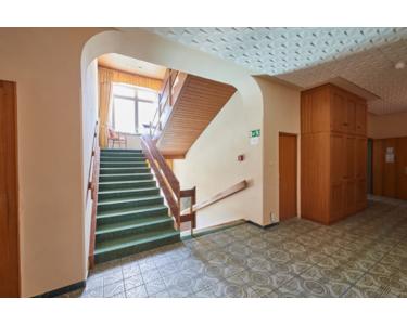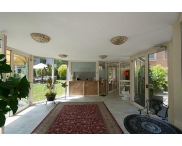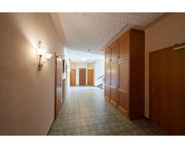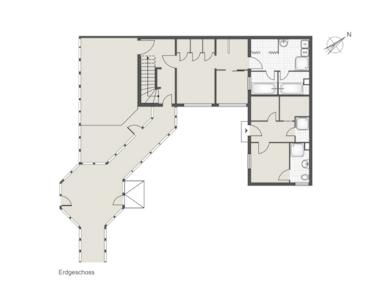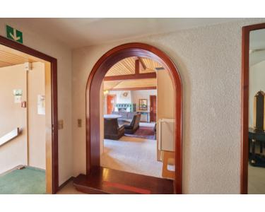Über einen verglasten und daher hellen Verbindungsbau erreichen Sie das Nebengebäude mit ca. 223 m². In diesem Verbindungsbau befand sich der Empfangs- und Bürobereich des Kurhotels.