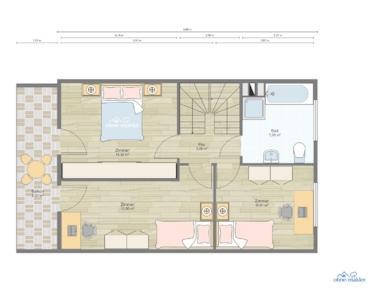 Obergeschoss: Flur mit Zugang zum Bad mit Dusche/Wanne, sowie den 3 hellen Kinderzimmern. 2 Kinderzimmer verfügen dabei über einen direkten Zugang zum Balkon.