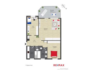 - Flur, Küche, Gäste-WC, Tageslichtbad mit Badewanne , Wohn- und Essbereich mit Zugang zur Terrasse, 2 Schlafzimmer,