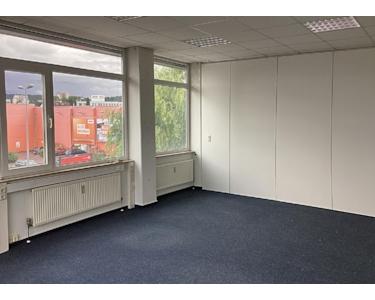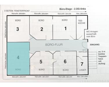 Der helle Büroraum in dieser Büroeinheit ist ein Eck-Büro mit großen Fenstern. Die Wände bestehen aus weißen Trennelementen. Auf der ganzen Bürofläche ist ein pflegeleichter grauerFilz-Teppichboden verlegt. Telefon, sowie Glasfasser-Anschluß für schnellen Internet