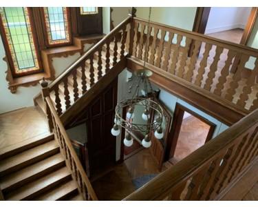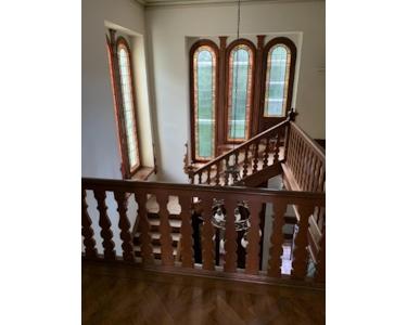 Das Erdgeschoss umfasst eine repräsentative Eingangshalle, einen großzügigen Wohnbereich/Salon, ein Esszimmer, eine helle Küche, ein Schlafzimmer, ein Duschbad und eine separate Toilette. Hohe Glasfenster und eine verzierte Holzdecke unterstreichen das elegante Ambiente. Eine geschwungene Holztreppe führt in die mittlere Etage/1. Obergeschoss mit vier Zimmern, Küche, Duschbad, separater Toilette und Balkonen.