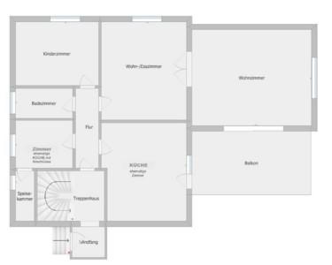Obergeschoss: Fünf weitere Zimmer (inkl. ehem. Küche), ein Bad mit Badewanne und ein Balkon.