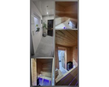 Sauna mit Dusche, WC und Waschbecken im Garagenbereich