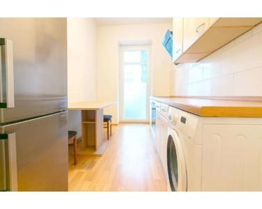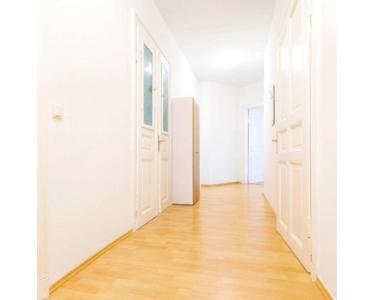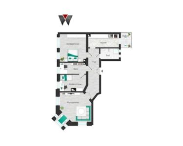 Sie betreten die Wohnung in einem geräumigen Flur, von dem aus drei Zimmer, das Badezimmer und die Küche mit Zugang zum Balkon begehbar sind. Ein weiteres Zimmer erreichen Sie durch den Vorraum eines Schlaf-/Kinderzimmers.